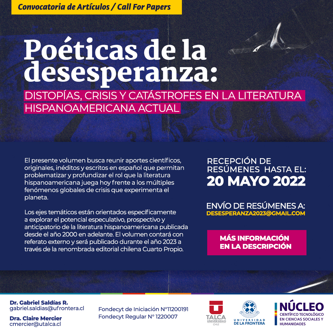 Los ejes temáticos del volumen estarán orientados específicamente a explorar el potencial especulativo, prospectivo y anticipatorio de la literatura hispanoamericana publicada desde el año 2000 en adelante. Esto implica imaginar caminos desde, a través y más allá de las experiencias límite que marcan nuestro acontecer actual para dar cuenta de realidades frágiles y en proceso de transformación constante.