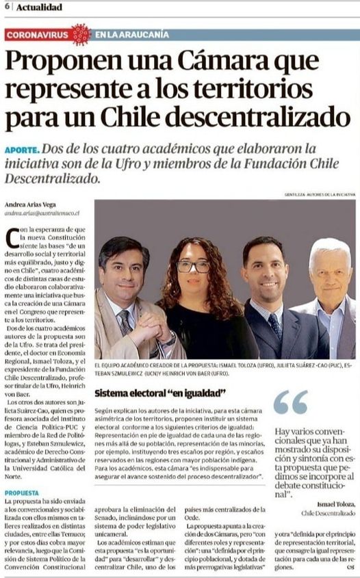 “Proponen una Cámara que represente a los territorios para un Chile descentralizado”. Parte de la propuesta fue elaborada por académicos de la Universidad de La Frontera, entre ellos Dr. Ismael Toloza, quien forma parte del Núcleo en Ciencias Sociales.